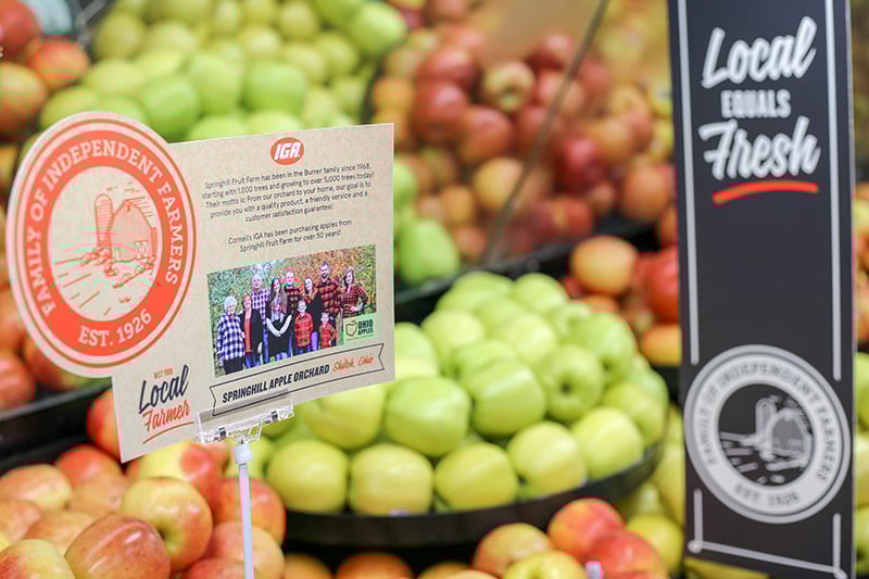 They introduced their almost 21,000 followers to the family farm Long & Scott Farm, with pictures of the farmers, along with the strawberries, corn, cucumbers, and other veggies they grow. Back in a November IGA Minute, we looked at how Brackett’s IGA used social media to generate excitement for a new relationship with a family farm in Maine. In addition to telling the story online, make sure to carry the storytelling throughout the store, using signage that is part of the “Local Equals Fresh” brand kit. At Geissler’s, they use magnetic signs in the produce and dairy departments to identify family farms.