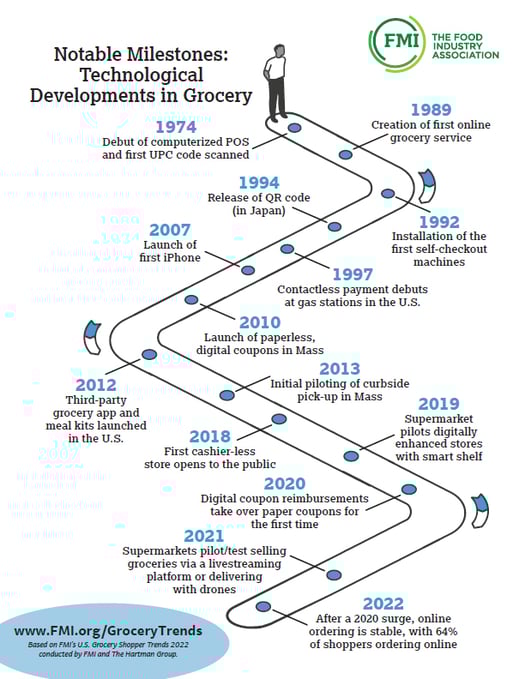 This infographic displays the technological developments in grocery throughout the years that have led to a hybrid world. (Photo courtesy of Business Wire)