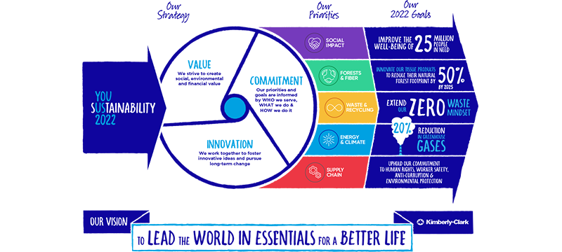 In 2022, Kimberly-Clark will have been in business for 150 years—and as we pave the way for another 150 years, sustainability must be at the heart of our business strategy. From source to shelf, we are working with our partners to foster innovative ideas that create long term change in the areas of social impact, forests and fiber, waste and recycling, energy and climate, supply chain.