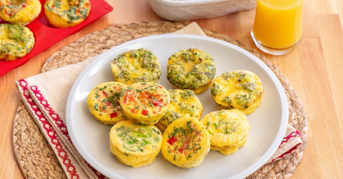 Mediterranean Egg Bites: Instead of the bacon or ham, add ¼ cup chopped fresh herbs (dill, Italian parsley, or a combination) and ½ cup sliced grape tomatoes or finely chopped red bell pepper. Swap out cheddar for crumbled feta.